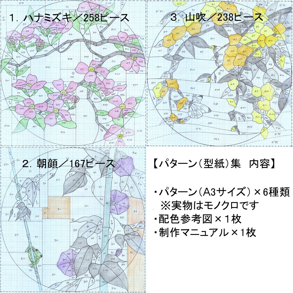 【ご注意】ガラス等の材料は入っていません。紙のパターンのみです。パターンはモノクロです。配色参考図(カラー)と制作マニュアルが入っています。